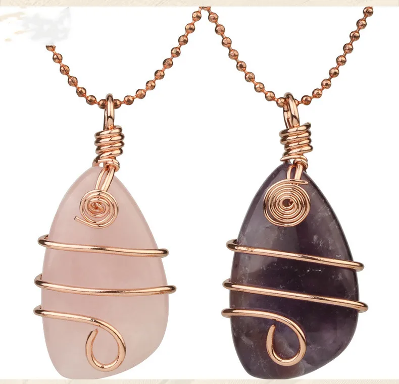 Wire Wrapped Natural Irregular Raw Crystal Pendant Necklace Healing Tumbled Gemstone Jewelry for Women Girl Amethyst Rose Quartz